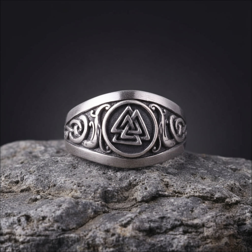 Crafted with precision and respect for Norse heritage, this Valknut Ring symbolizes the eternal bond between courage, fate, and the divine power of Odin. The Valknut, the ancient mark of fallen warriors, stands boldly at the center — surrounded by detailed dragon knot engravings representing strength, protection, and endless life.