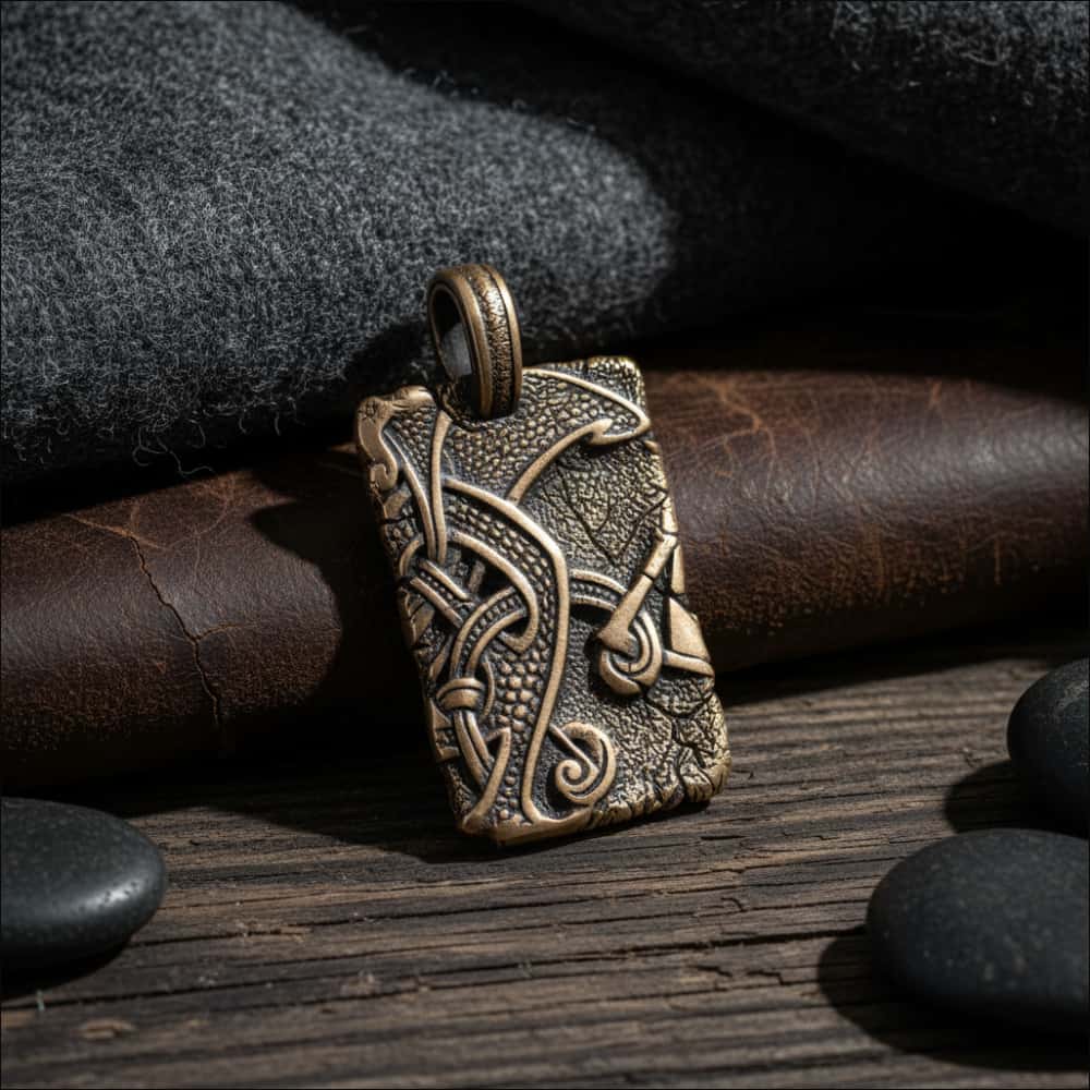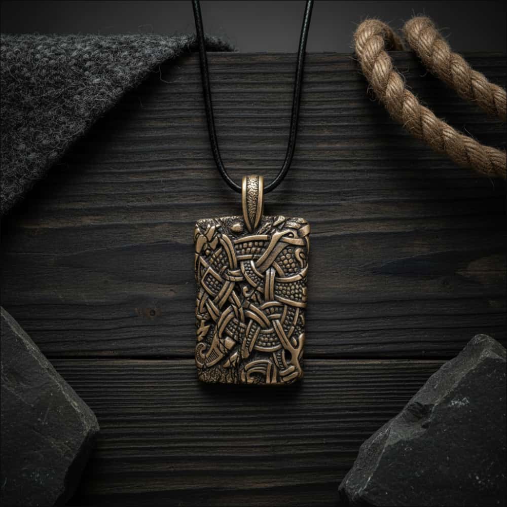 This pendant is built for those who don’t wear symbols for decoration — they wear them as a mark. Crafted in bronze and carved with Mammen-style knotwork, it carries the same ancient rhythm found in Scandinavian art: interwoven lines that represent endurance, protection, and the strength to hold your path through chaos.