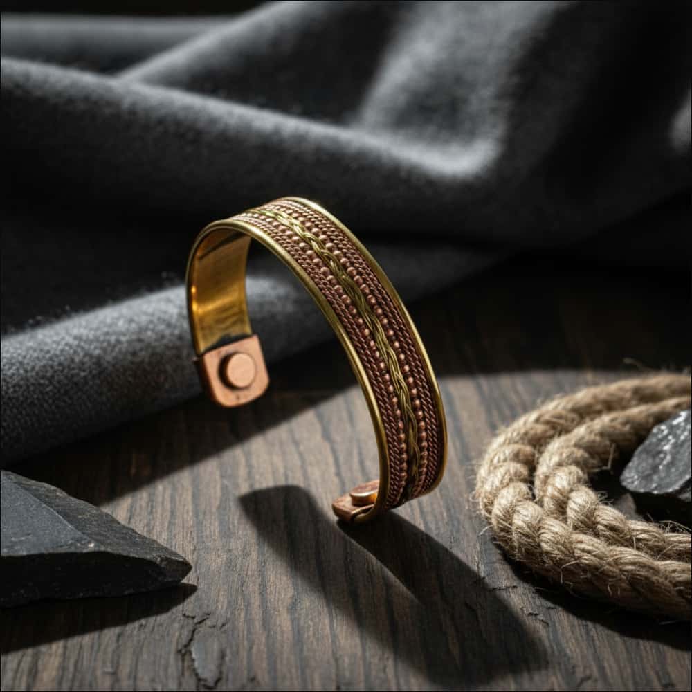 Forged in layered copper and brass tones, The Bastion Cuff draws inspiration from ancient craftsmanship worn across the frontiers of Europe during late Antiquity. Multiple braided and beaded wires are bound into a solid open cuff, creating a piece that feels structured, grounded, and enduring.